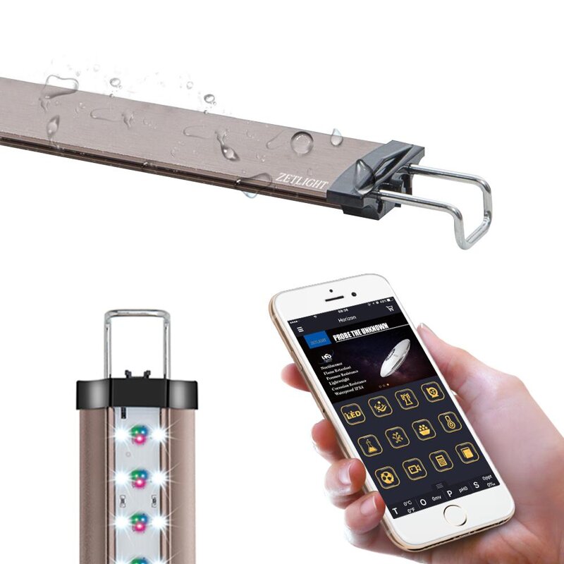 Può essere controllata tramite l’app Horizon Aqua, scaricabile da Apple App Store (iOS) o Google Play Store (Android). L’app Horizon Aqua consente la personalizzazione dell’intensità e dei colori della luce da 1 a 100%, l’impostazione dei programmi diurni e notturni e la previsione delle modalità nuvoloso, fulmini e altro.